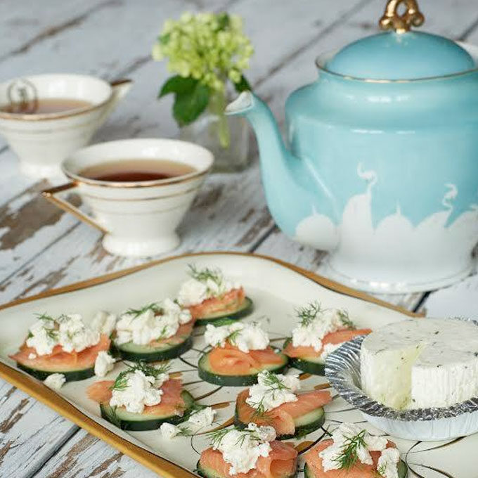 Whether you’re hosting a tea party shower or just looking for something tasty—top sliced cucumbers with smoked salmon, Boursin Shallot & Chive Cheese, and a sprig of dill.