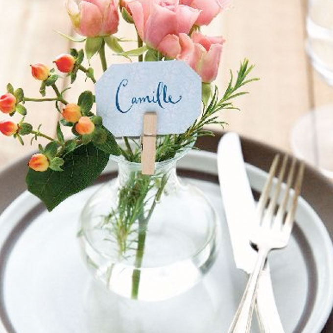 Spruce up your table setting. Use various small bottles and vases to create personalized floral arrangements for each guest.