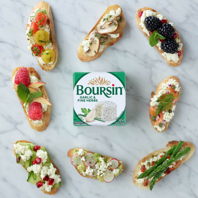 Get The RecipeFill a piping bag with the Boursin Cheese of your choice and squeeze it onto a freshly baked tart. Garnish with veggies and herbs.
