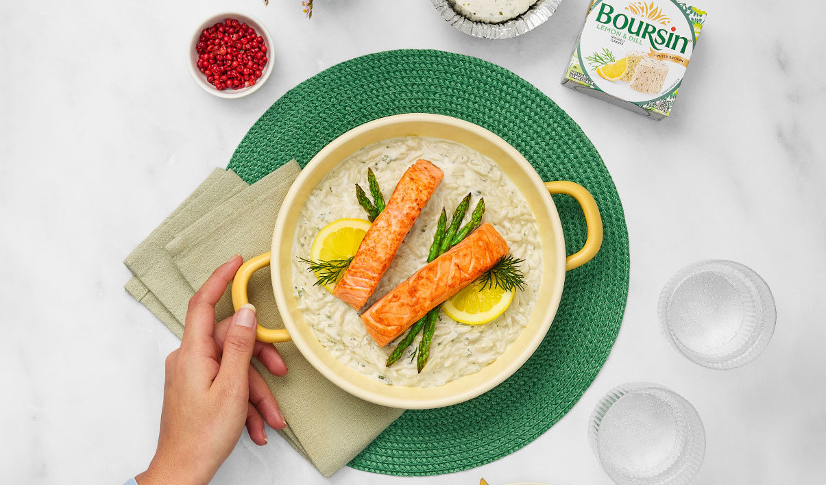Bring everyone to the table for a convivial meal with this Grilled Salmon & Skillet Orzo recipe. Perfectly pan-seared salmon filets and tender sautéed mini asparagus are served over a bed of creamy orzo, infused with the bright, herby flavor of melted Boursin® Lemon & Dill Cheese. Finish the plate in style with a sprig of fresh dill, a couple of lemon slices, and a crack of black pepper. Yum! This elegant yet effortless dish is ideal for sharing and savoring together.