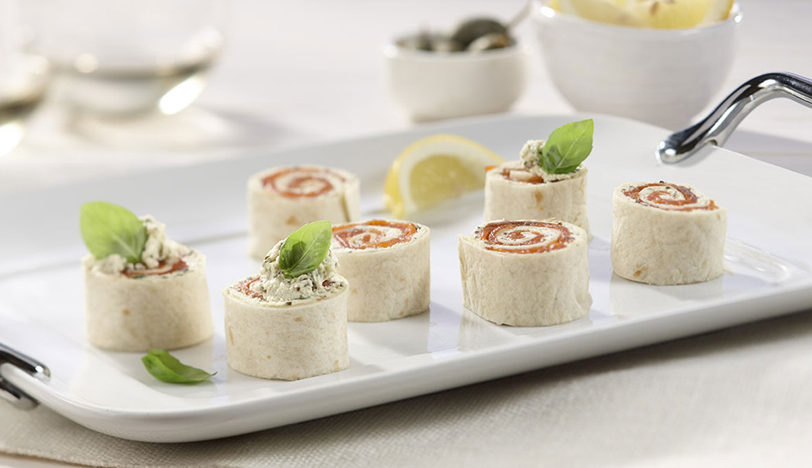 Enjoy easy and tasty salmon roll-ups with Basil and Chive cheese, capers, and a perfect pinwheel presentation.